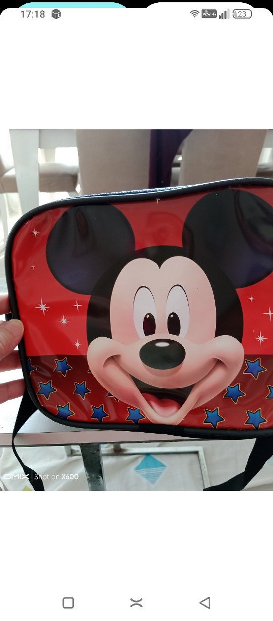 Parlak kırmızı renkte, büyük Mickey Mouse yüzü ve mavi yıldız desenleri bulunan çocuk okul çantası.
