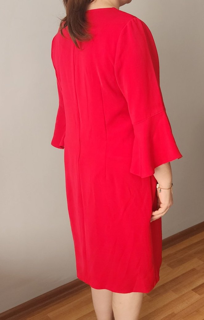 Parlak kırmızı renkte, uzun kollu ve normal kesime sahip midi boy iş elbisesi. Desensiz, sade tasarımıyla dikkat çeker. 44 46 48 bedene uyumludur kol boyu 40 eni 50 boyu 99