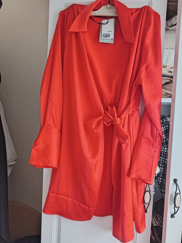 Parlak kırmızı renkte, uzun kollu ve midi boyda kadın elbisesi. Bol kesim ve baskılı desenli, Paris sokak modasına uygun. Belden bağlamalıdır.