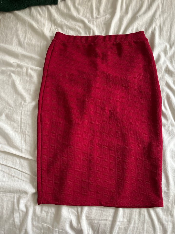 Parlak kırmızı sentetik kumaştan, drapeli, normal boyda ve vücuda oturan midi kalem etek. Minimalist ve normcore tarzını yansıtır. ✨
