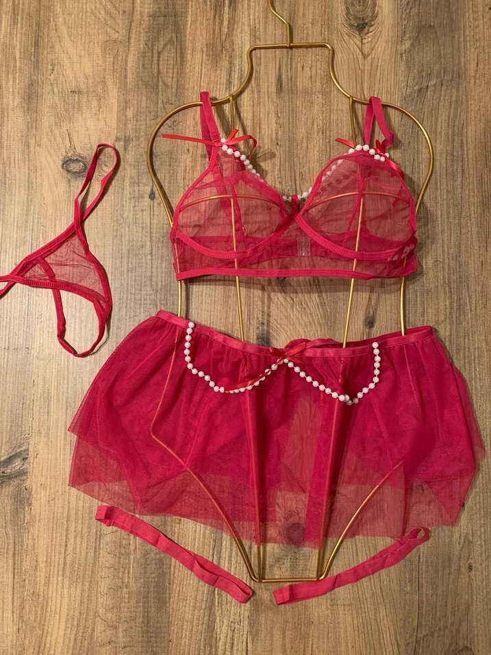 Parlak kırmızı renkte, mini boyda, desensiz bohem tarzda kadın iç giyim seti. İnci detaylı sütyen, mini etek ve tanga içerir. ✨