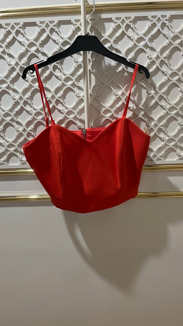 Parlak kırmızı, nakışlı ve fermuarlı sırt detaylı, ince askılı ve straplez kesime sahip mini uzunlukta dar kesim büstiyer. ❤️ s beden