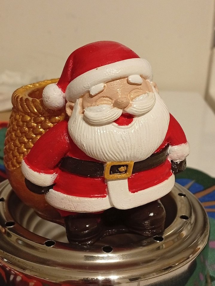 Parlak kırmızı renkte, beyaz sakallı ve siyah kemerli neşeli bir Noel Baba figürini.