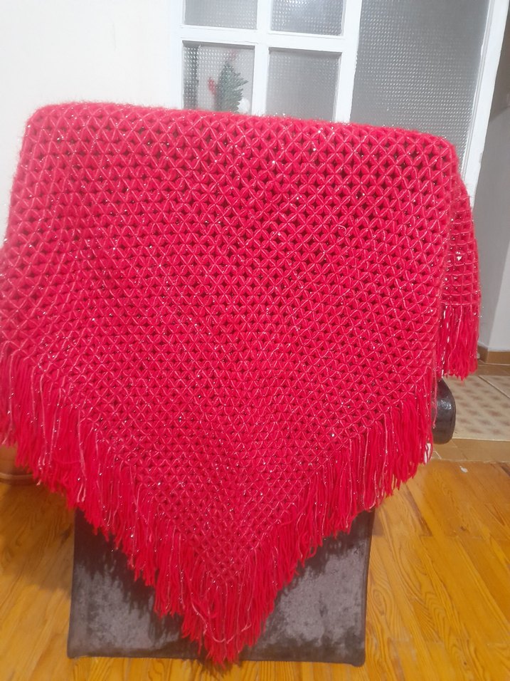 Parlak kırmızı renkte, örgü yapıya sahip kadın şalı. Rahat ve bohem tarzıyla retro ve hippie dokunuş katar. iki yönlü kullanılabilir