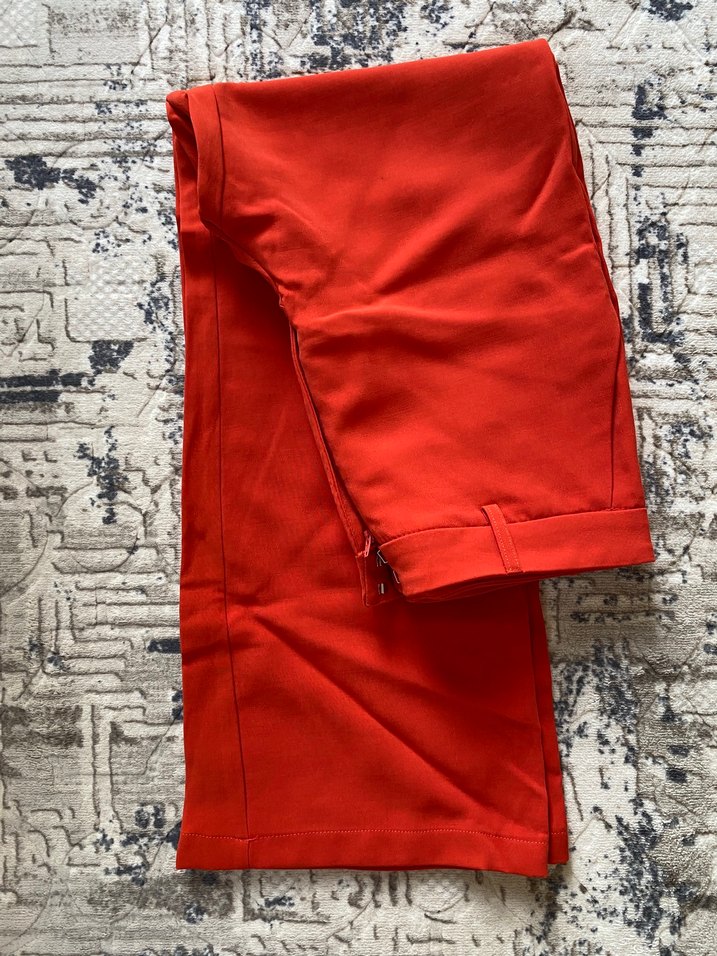 Parlak kırmızı renkte, fermuarlı detaylı, düz kesim kadın pantolonu. Zara marka. L(40) beden. Üründe hiçbir deforme yoktur hiç giyilmedi.