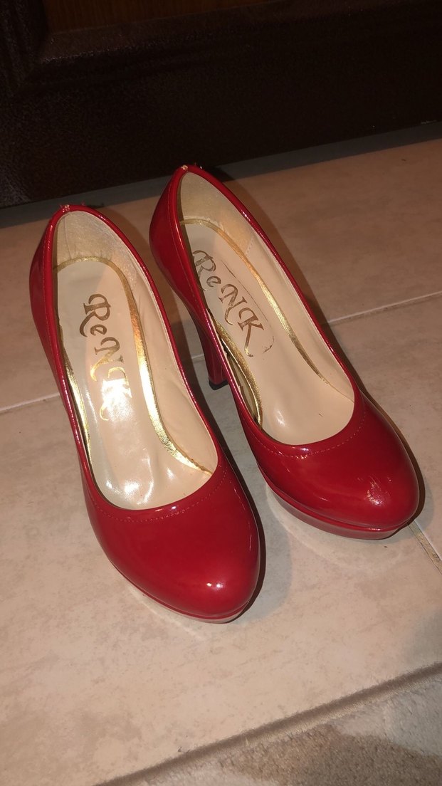 ReNK markalı parlak kırmızı platform topuklu stiletto, romantik akşamlar için ideal modern klasik tarzda. 11 cm topuklu