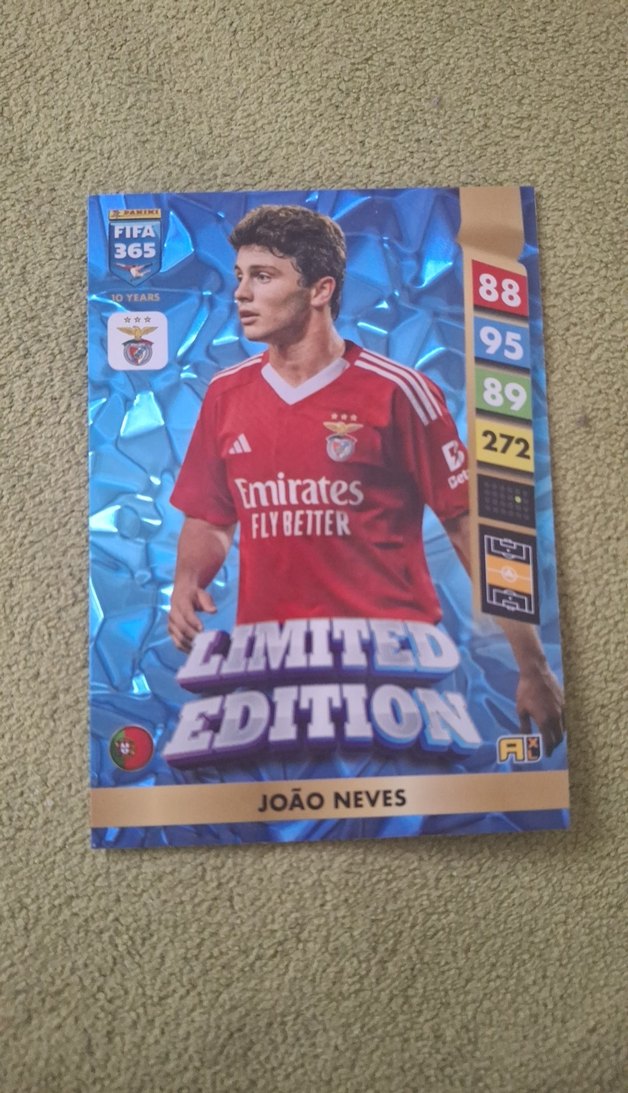 Parlak kırmızı renkte, futbolcu João Neves'in yer aldığı cesur pop kültür ve atletik tarza sahip rozet. FIFA 365 ve Emirates logoları içerir. ⚽