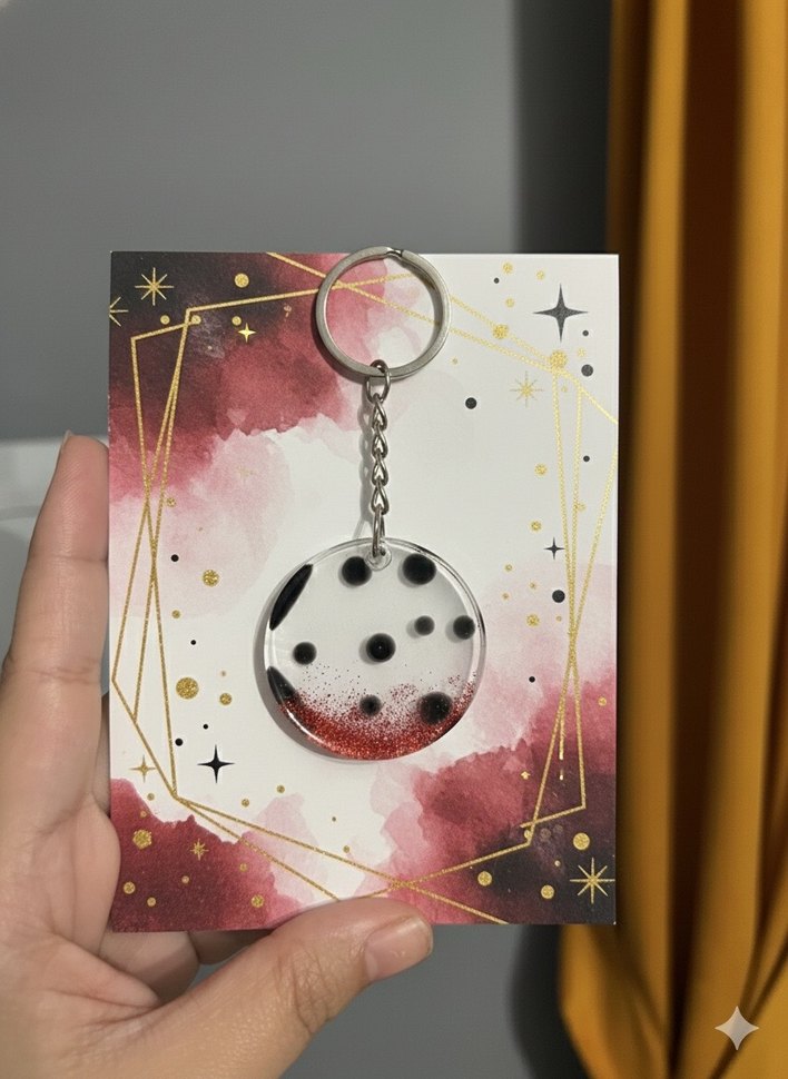 Parlak yüzeye sahip, koyu kırmızı ve siyah puantiyeli, minimalist ve rock punk tarzını yansıtan dairesel anahtarlık. Pop kültür esintili bir tasarım.