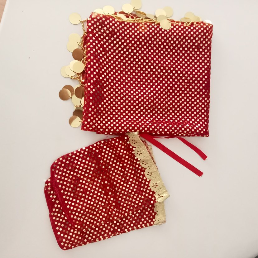 Parlak kırmızı pullarla kaplı kına örtüsü ve eldiveni, kenarlarında küçük yuvarlak süslemeler bulunur.Bir kez kullanıldı, deformesi yoktur,sadece tek eldivenin dantelinde aşınma var. #kinaortusu ️