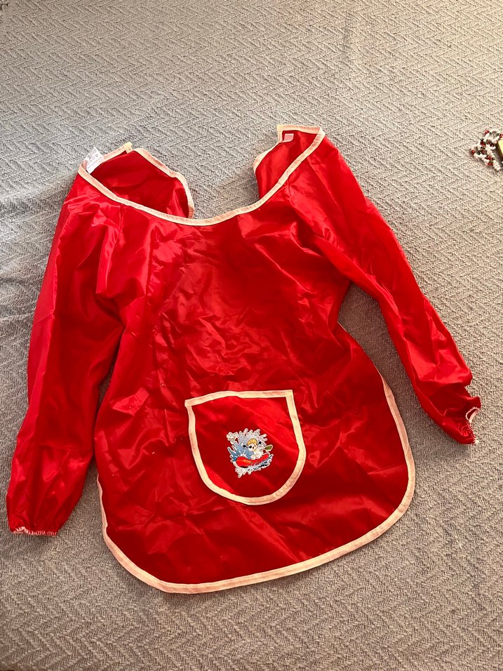 Uzun kollu, parlak kırmızı bebek önlüğü, ön cepte sevimli nakış deseni ve açık renk şerit detaylıdır.