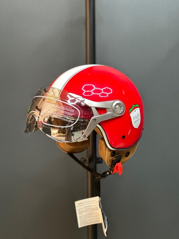 Parlak kırmızı renkte, cam vizörlü ve renkli baskılı desenli retro tarzında motosiklet kaskı. İstediğiniz modele göre ilan açtırtınız Sıfır ürün M L XL Bedenleri vardır. Polikarbon Dış Kabuk • Renkli Gece görüş engellemeyen vizör • Ecer22.06 serifikalı • Dot onaylı