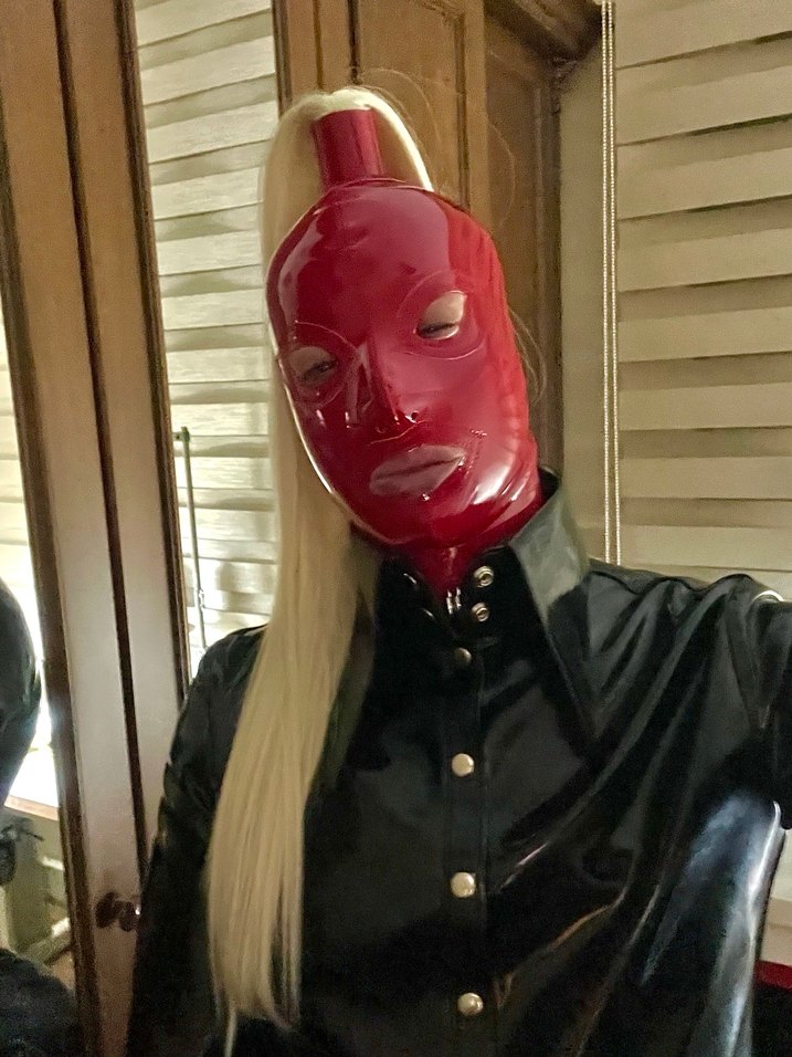 Parlak kırmızı deri maske, göz ve ağız için açıklıklarla, siyah deri ceketle birlikte. Maske üzerinde üstte at kuyruğu detayı bulunur. ️