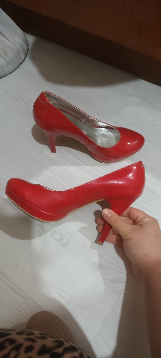 Parlak kırmızı rugan stiletto topuklu kadın ayakkabı Desensiz Kına gecemde 3 saatlik giydim tertemiz durumda şuanda 2 yıl beklediği icin küçük soyulmalar var hiç belli olmuyor neredeyse
