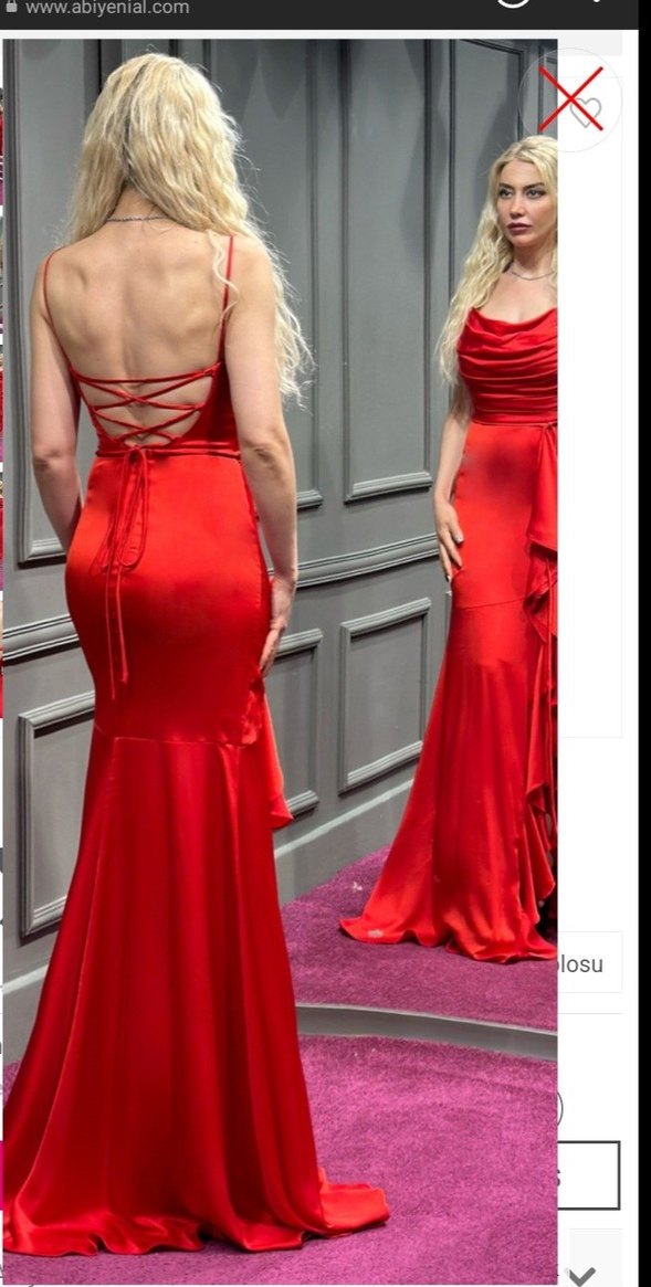 Sırt detaylı, drapeli yaka ve ince askılı, parlak kırmızı uzun abiye elbise. Düğünler için modern ve şık bir tercih.