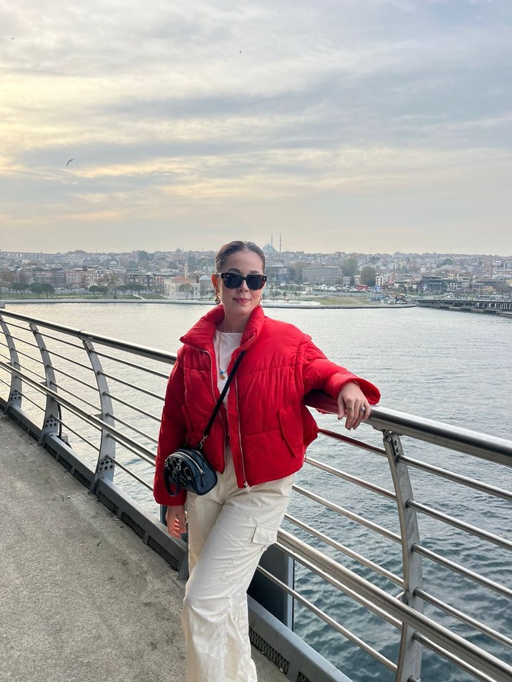 Parlak kırmızı şişme mont, bol kesim ve yüksek yakalıdır. Uzun kollu ve yumuşak kumaştan yapılmıştır, sokak stiline uygundur.