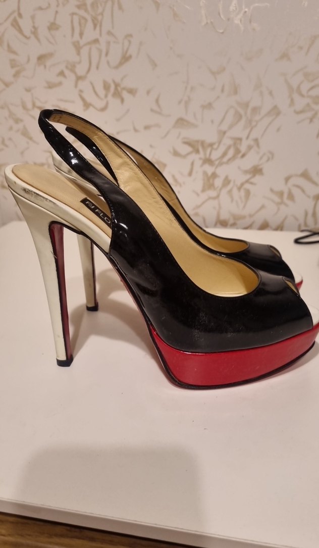 Parlak kırmızı platformlu, siyah üst kısmı ve beyaz topuklu modern klasik stilettolar. Dayanıklı kauçuk malzemeden, desenli tasarıma sahip. hiç kullanilmadi