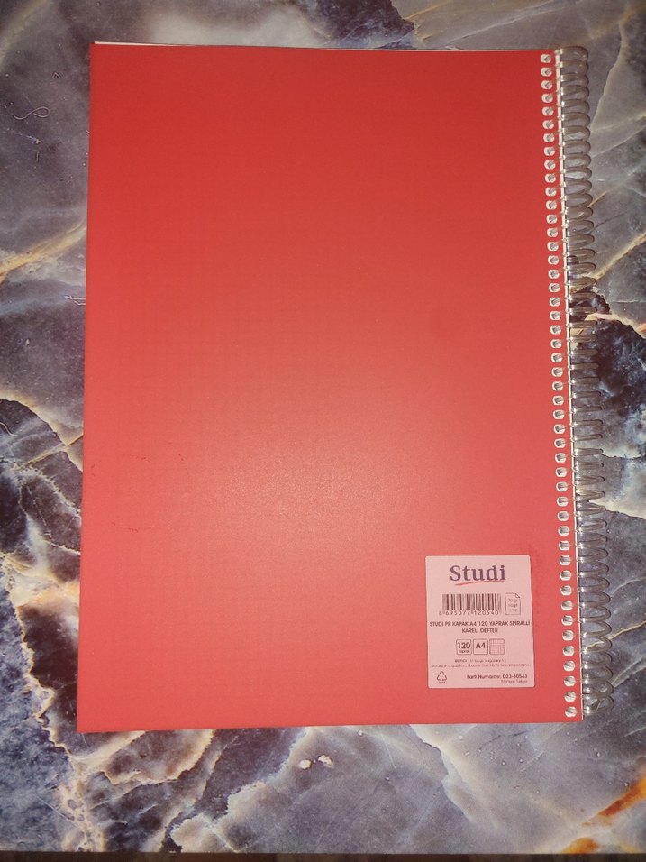 Parlak kırmızı kapaklı, spiral bağlı "Studi" etiketli defter. Yazı ve not almak için uygundur. elimde renkleri mevcuttur çoklu alımda fiyatta indirim uygulanır
