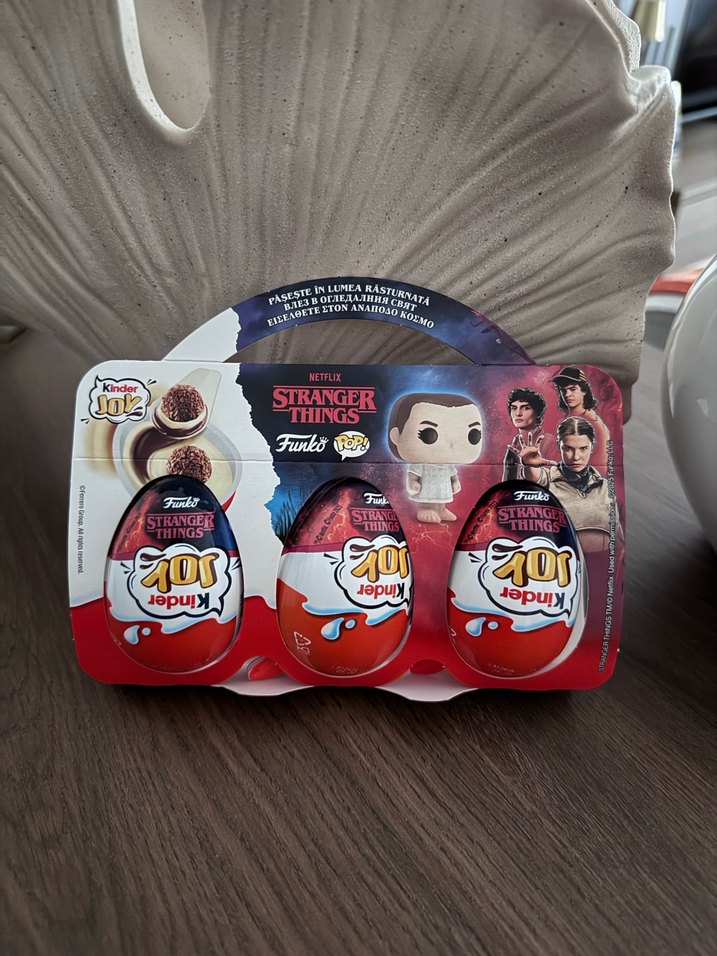 3’lü çantalıdır Parlak kırmızı renkli Kinder Joy yumurtaları ve Stranger Things temalı Funko Pop figürü içerir.