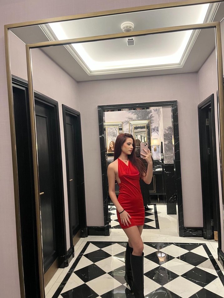 Parlak kırmızı ekose desenli, straplez ve ince askılı, vücuda oturan mini elbise. İpek gibi dokusu ve çağdaş tarzıyla romantik akşamlar için uygun. bir kez giyildi özel günde