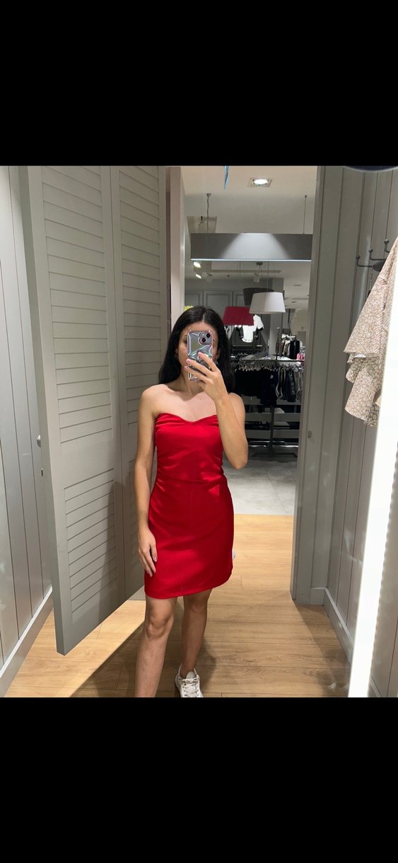 Parlak kırmızı, straplez mini elbise, ipeksi kumaştan, romantik akşamlar için şık ve dikkat çekici. Kolsuz ve desensiz, cesur sokak stili sunar.