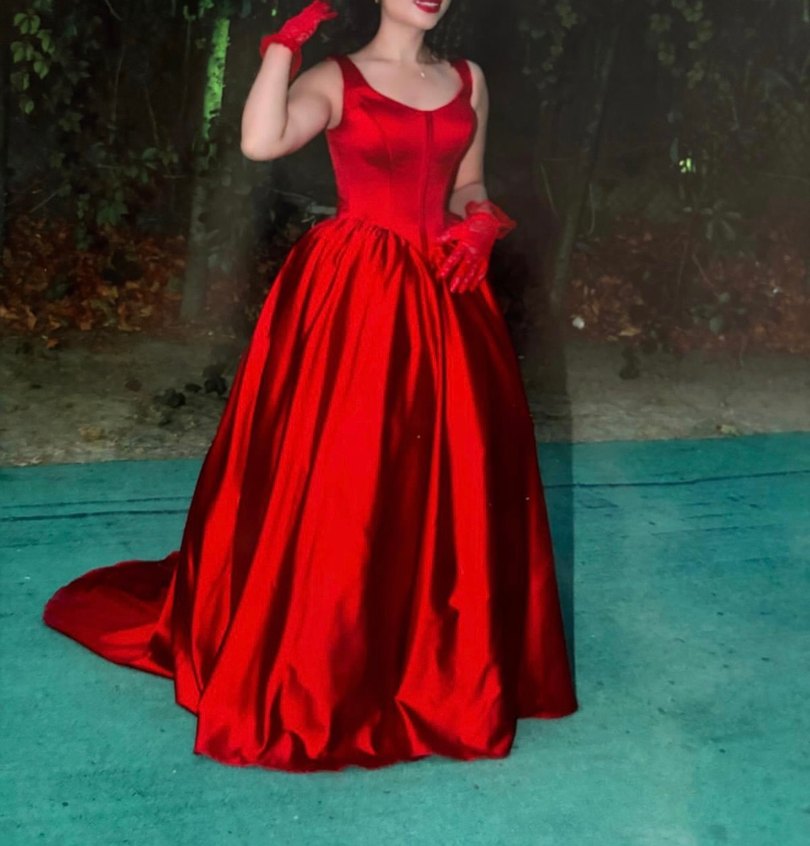 Parlak kırmızı kumaştan, straplez ve kolsuz uzun abiye elbise. Oturmuş kesimi ve drapeliyle gotik ve şık bir görünüm sunar.