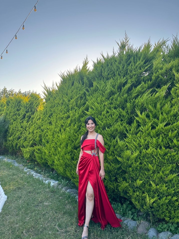 Parlak tie-dye desenli, straplez ve drapeli kırmızı uzun elbise, bohem tarzı ve iddialı görünümüyle düğünler için uygundur. Fit kesimle şıklık sunar.