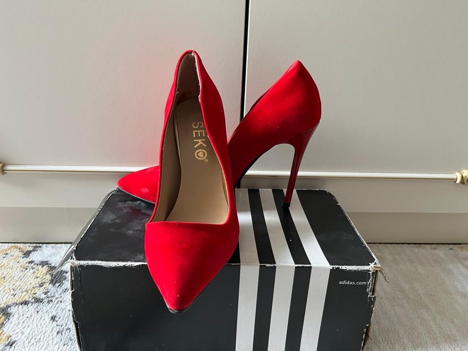Parlak kırmızı süet stilettolar, cesur ve klasik tarzı yansıtır. Romantik akşamlar için ideal, iç kısımda SEKO yazılıdır.