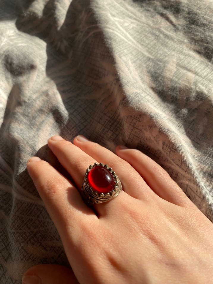 Detaylı bohem tarzında, parlak kırmızı taşlı erkek yüzüğü, retro ve hippie stillere uygundur.
