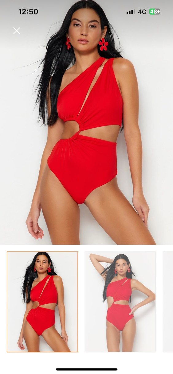 Parlak kırmızı renkte, tek omuzlu ve kesik detaylı, vücuda oturan kadın mayosu. Minimalist ve pop kültür tarzında, plaj için zahmetsiz şıklık sunar.