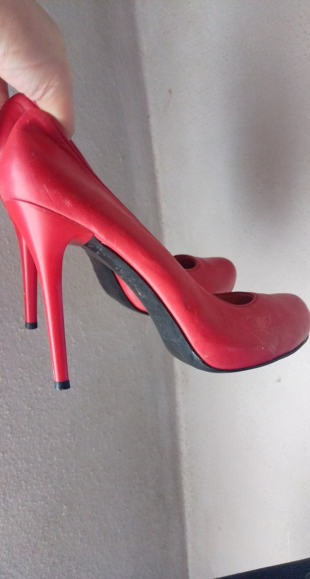 Parlak kırmızı renkte, tokalı detaylı kauçuk stiletto topuklu kadın ayakkabısı. Cesur ve gotik Paris tarzını yansıtır, romantik akşamlar için uygun. ❤️
