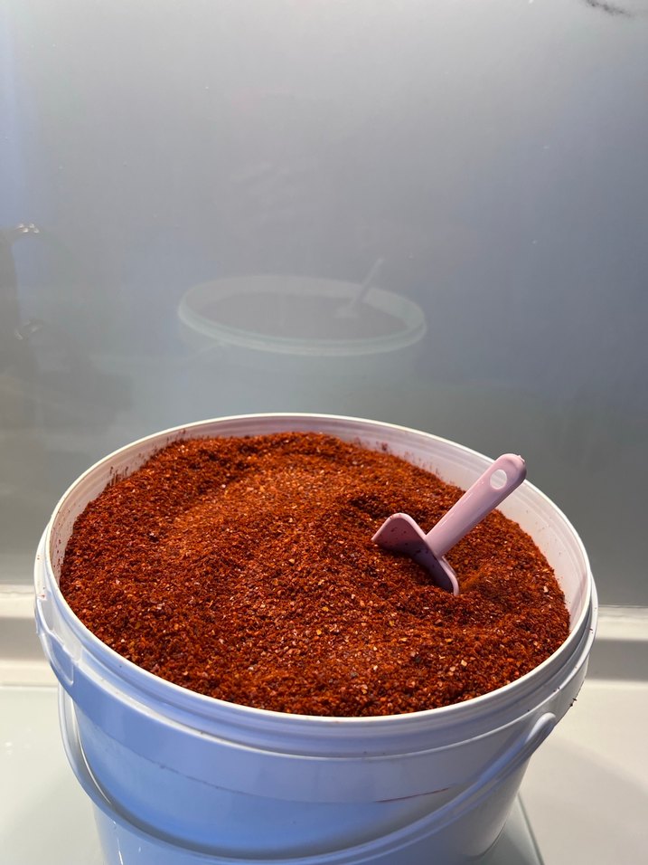 Parlak ve canlı kırmızı renkte toz, beyaz kova içinde küçük bir kepçe ile birlikte. ️