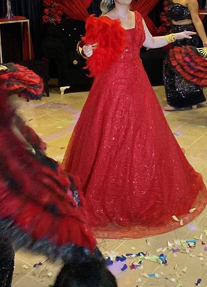 Bu parlak kırmızı abiye, desenli ve simli kumaşıyla uzun ve dar kesimdir. Askısız ve kolsuz yapısıyla göz alıcıdır. ✨