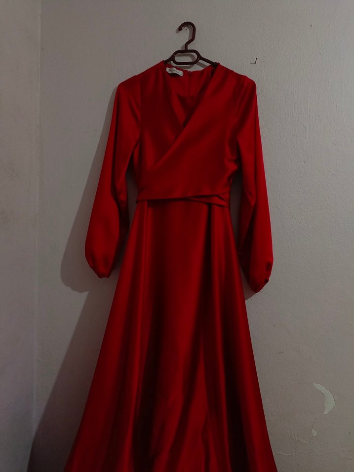 Parlak kırmızı uzun elbise, drapeli tasarımı, V yakası ve uzun kolları ile minimalist ve çağdaş tarzda, düğünler için uygun.