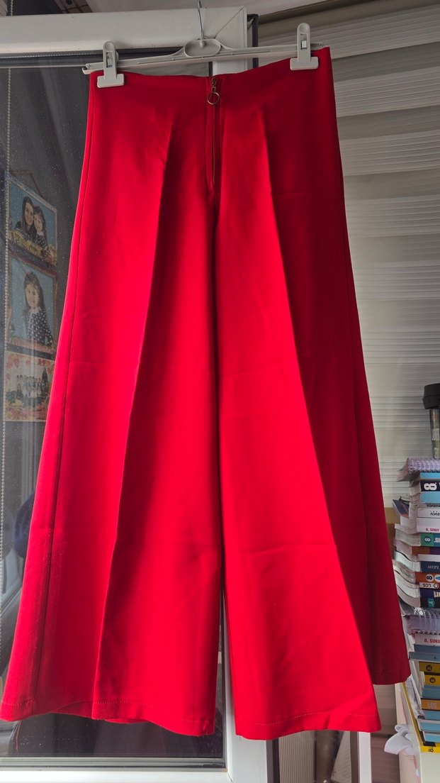 Parlak kırmızı renkte, uzun ve dökümlü kadın kumaş pantolon.