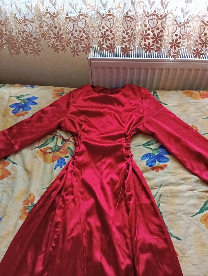 Parlak Kırmızı Uzun Kollu Drapeli Kadın Elbise 1 defa kullanıldı