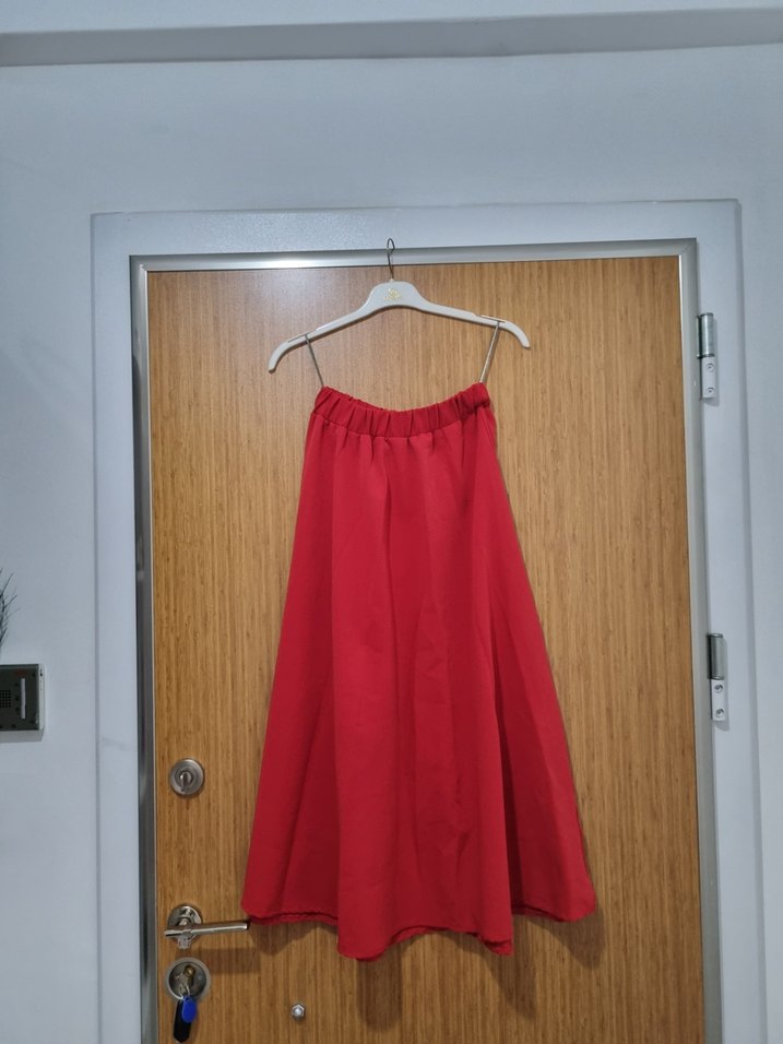 Kadınlar için uzun, salaş kesim ve drapeli detaylara sahip, parlak kırmızı sentetik kumaştan üretilmiş etek. Minimalist ve şık tarz için uygundur.