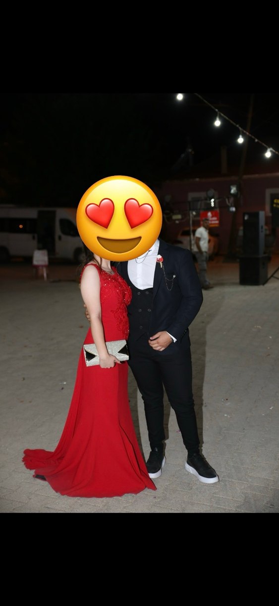 Parlak kırmızı, uzun ve vücuda oturan bu nişan elbisesi, çentikli yaka ve askılı kollara sahiptir. Yırtmaç detayı ve cesur gotik tarzı için uygundur. ❤️