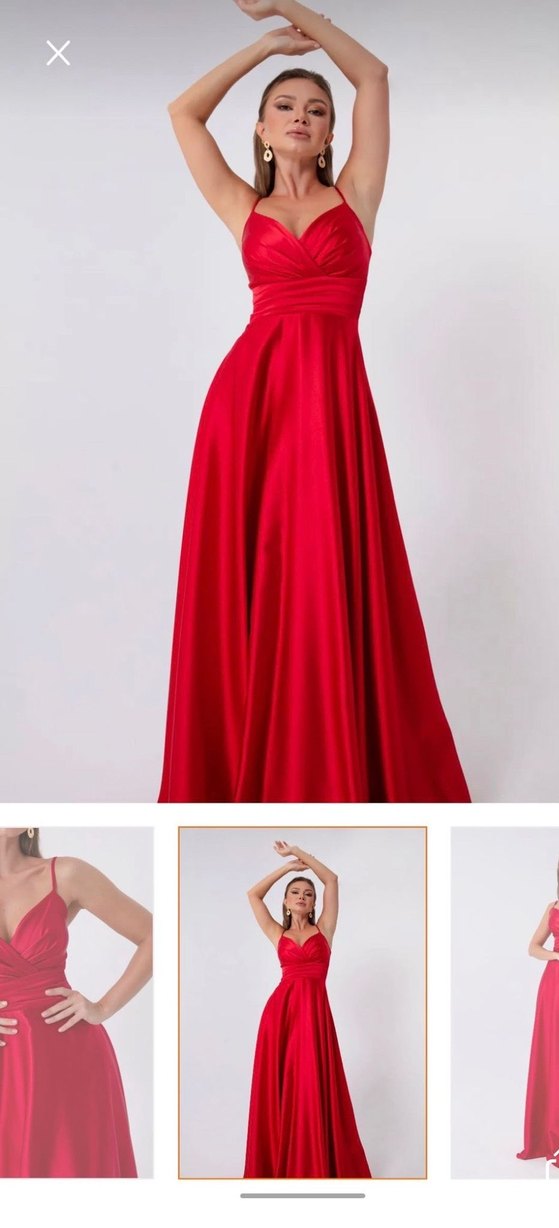 Dar kesim, V yaka ve ince askılı, parlak kırmızı uzun abiye. Dökümlü tasarımı ile düğünler için göz alıcı bir seçenek. ✨