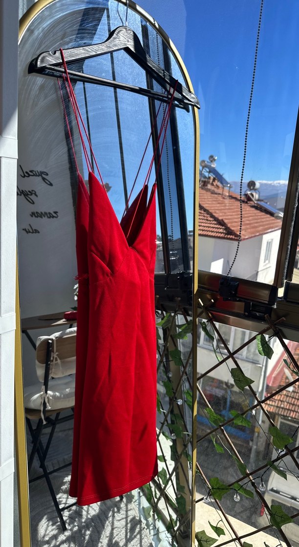 Parlak kırmızı renkte, V yaka ve ince askılı, drapeli tasarıma sahip, vücuda oturan midi uzunlukta elbise. Cesur dış mekan sokak stili için uygun. Sırtı çapraz