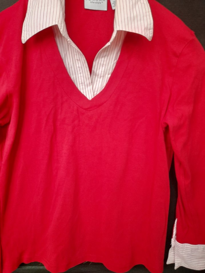 Parlak kırmızı renkte, V yaka ve düğmeli manşetlere sahip uzun kollu hamile gömleği. Pamuk kumaştan, rahat ve bol kesim, ofis için uygun. Desensiz, çağdaş Paris tarzı.