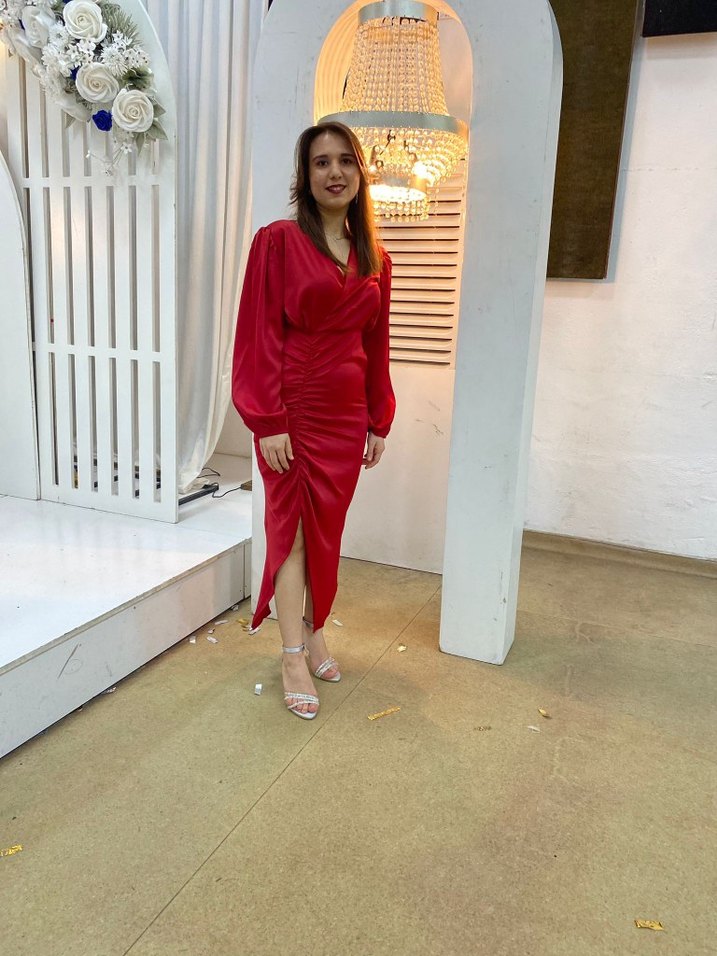 Parlak kırmızı renkte, V yakalı ve uzun kollu, drapeli, vücuda oturan uzun elbise. 1 kere giyilfi hiç bir sorunu yoktur sapasağlam