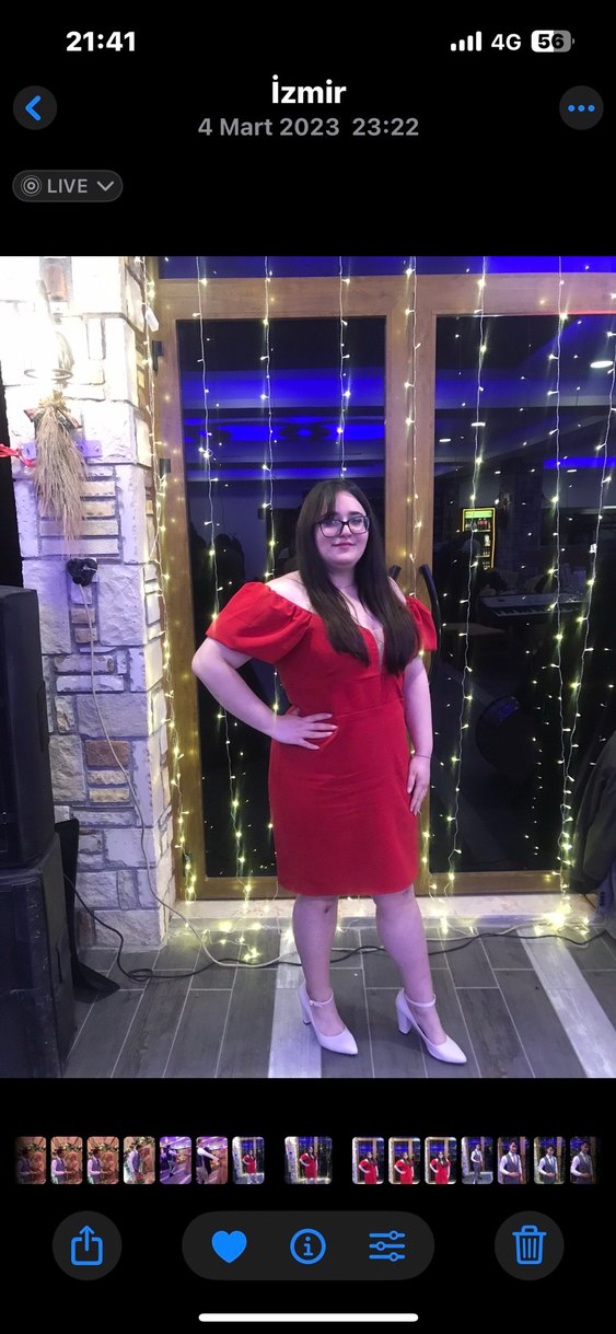 Parlak kırmızı renkte, V yakalı ve balon kollu, vücuda oturan midi uzunlukta kadın gece elbisesi. ✨