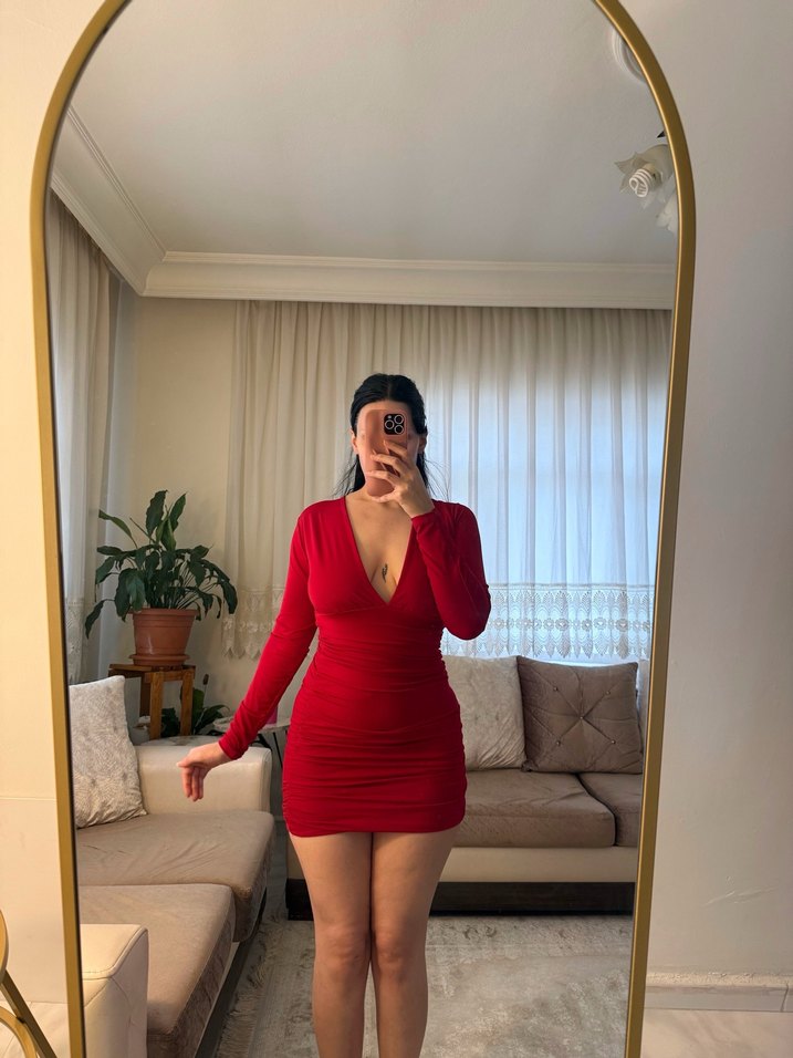 Parlak cam görünümlü kumaştan, derin V yakalı ve uzun kollu, dar kesim kırmızı mini elbise. Minimalist ve çağdaş tarzıyla romantik akşamlar için zahmetsiz şıklık sunar. ✨