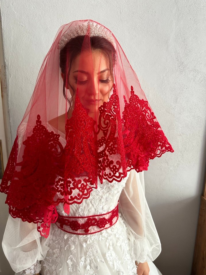 Parlak kırmızı vintage dantel detaylı düğün yüz örtüsü kurdelası, trend belirleyiciler ve avant-garde tarzı sevenler için geleneksel tasarımda. Yanında paketinde yeni ikili kurdele hediye