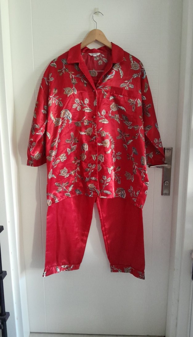 Parlak kırmızı renkli, vintage desenli kadın pijama takımıdır. Bol kesim uzun kollu üst ve midi boy pantolondan oluşur.