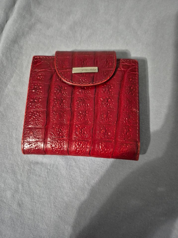 Parlak kırmızı yılan desenli deri cüzdan, çıtçıtlı kapanışı ve Paris tarzı ile dikkat çekiyor. gerçek deridir