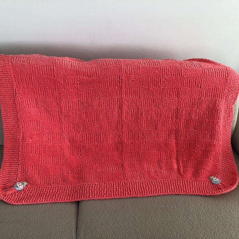 Parlak kırmızı renkte, örgü dokulu ve yumuşak kumaştan çocuk battaniyesi.