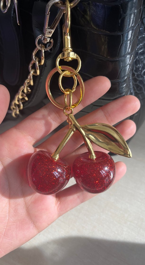 Parlak kırmızı kiraz figürlü, altın renkli zincir ve yaprak detaylı, cesur ve göz alıcı gotik tarzda anahtarlık.