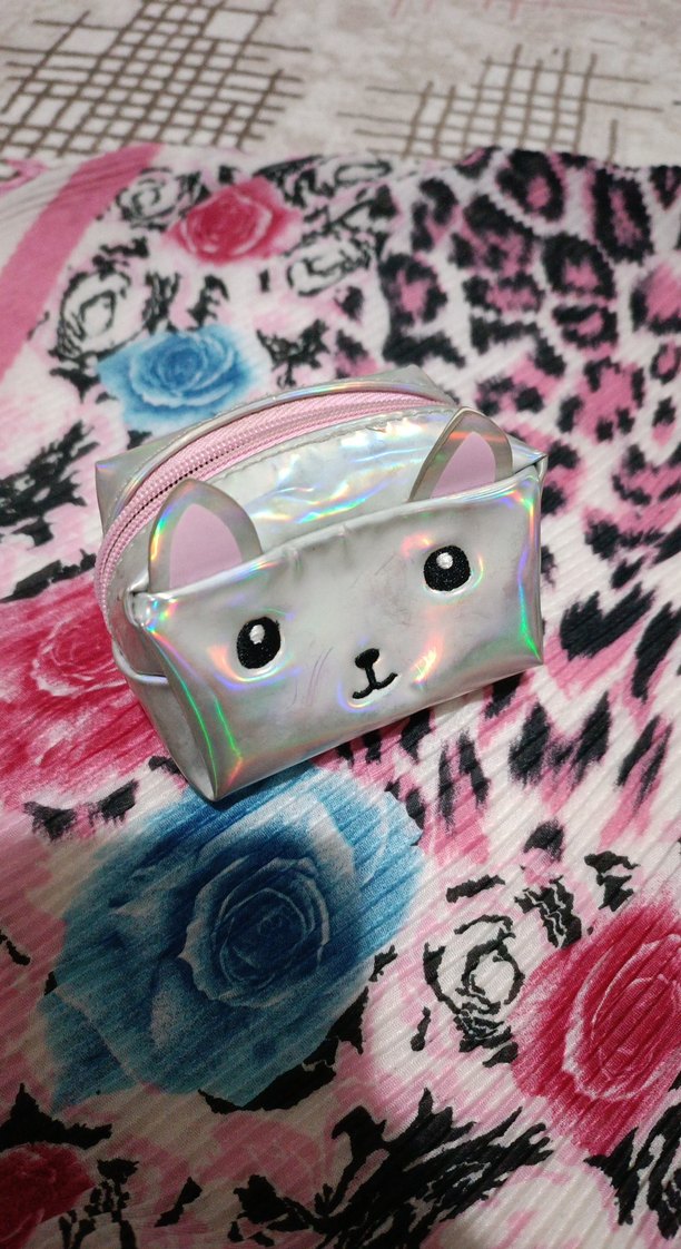 Parlak gümüş renkli, fermuarlı çantada sevimli kedi kulakları ve yüz detayı bulunur. Pastel tonlarıyla rock punk tarzına uygun yumuşak bir dokunuş sağlar.