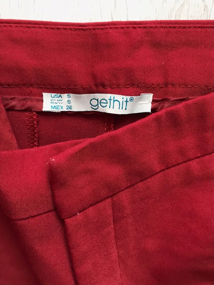 Parlak kırmızı sentetik kumaştan, düğmeli ve vücuda oturan pantolon. Üzerinde 'gethit' etiketi bulunur.